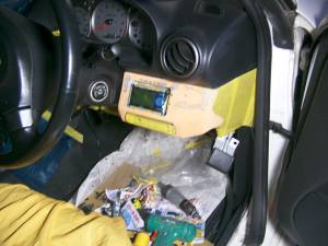 打ち合わせの段階では、 ハンドルの左側のスペースを 利用して、その部分に埋め込む 為のカバーを作るという内容でした。 矢印の部分は、エアコンのセンサーが あるので、なるべくこの部分は 加工しない方向で作業する予定でした。